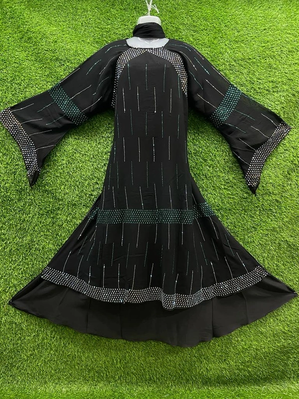 Humeira Abaya Dubai Style Stone Work Abaya Burkha in Al Nida Black Fabric Front Multi Colour Stone Line Black
